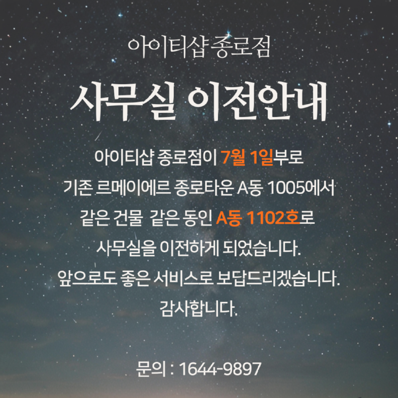 아이티샵 종로점이 7월 1일부로 기존 르메이에르 종로타운 A동 1005호에서 같은 건물 A동 1102호 사무실을 이전합니다. 감사합니다.